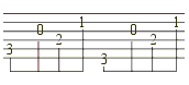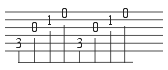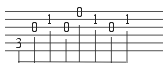 E (leer)-F (1. Bund)-Fis (2. Bund)-G (3. Bund)-Gis (4. Bund)-A (5. Bund)
